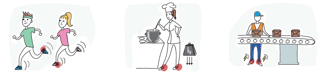 - Stojavá zaměstnání. Tovární dělníci, učitelé, chirurgové, zubaři, číšníci a servírky, poštovní doručovatelé, kadeřnice a další, kteří tráví většinu své pracovní doby chůzí nebo stáním na tvrdých površích, často mají zkušenosti s bolestmi chodidel.